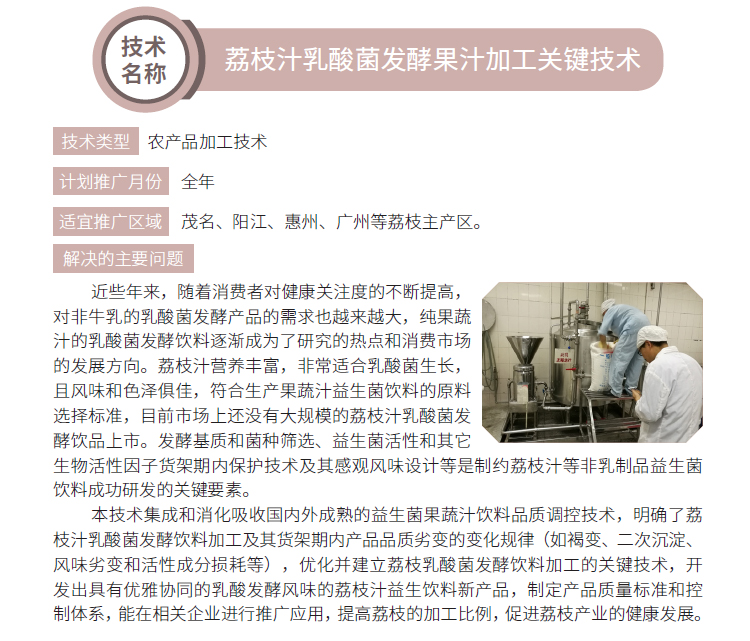 2019年主推技术:荔枝汁乳酸菌发酵果汁加工关键技术