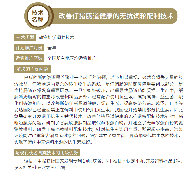 2019年主推技术:改善仔猪肠道健康的无抗饲粮配制技术