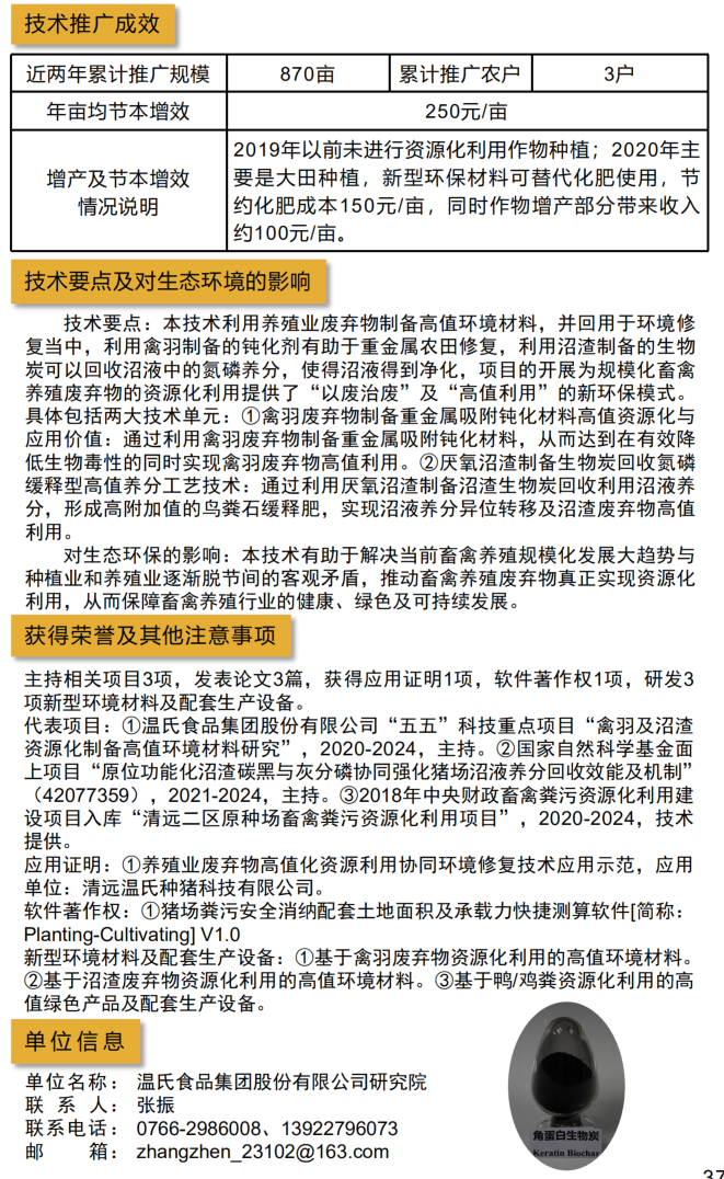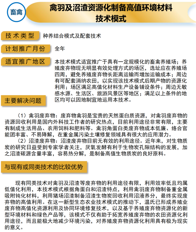 2021年农业主推技术:禽羽及沼渣资源化制备高值环境材料 技术模式