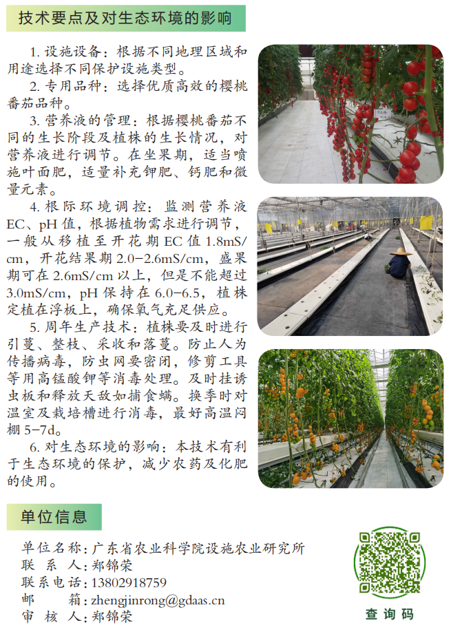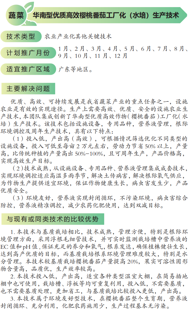 2022年农业主推技术:华南型优质高效樱桃番茄工厂化(水培)生产技术