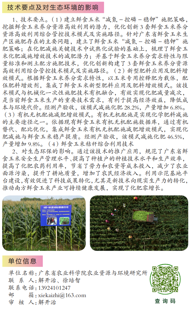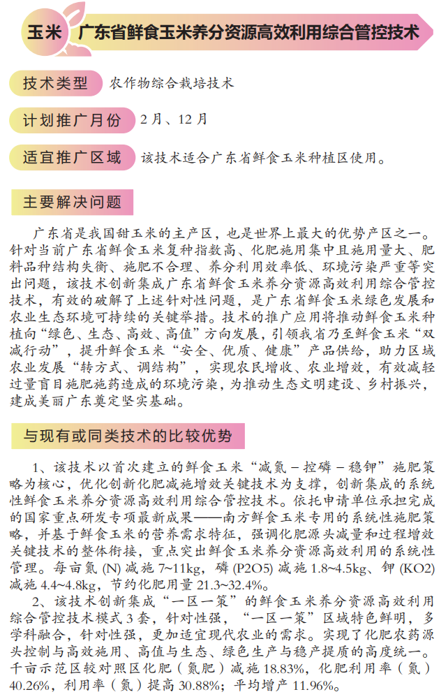2022年农业主推技术:广东省鲜食玉米养分资源高效利用综合管控技术