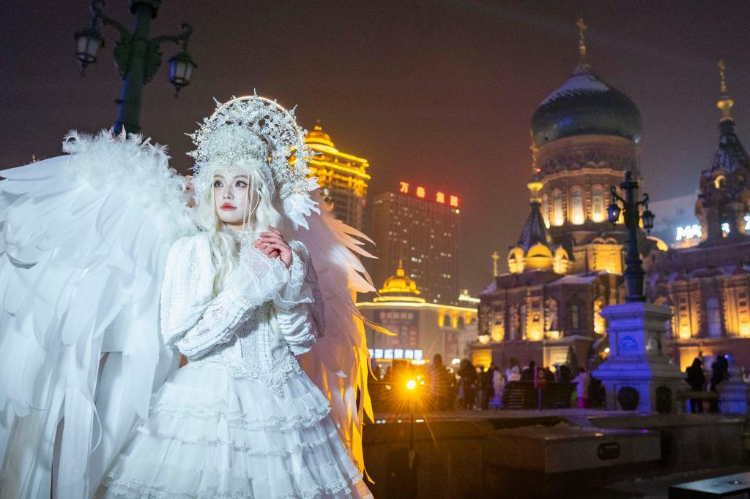 1月23日,在哈尔滨市地标建筑索菲亚教堂附近,游客身着盛装拍摄写真。新华社记者谢剑飞 摄