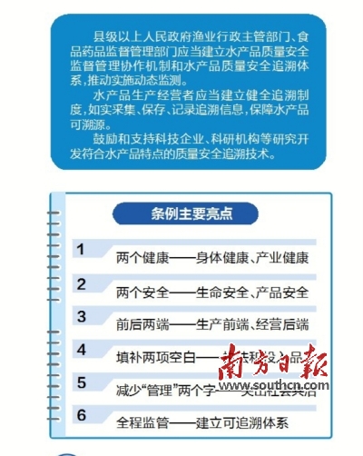 作为全国第一部水产品质量安全地方性法规,《广东省水产品质量安全条例》有哪些亮点?广东省海洋与渔业厅副厅长洪伟东介绍,农业部相关负责人在省海洋与渔业厅关于《条例》立法情况的报告上批示:《广东省水产品质量安全条例》的出台,在全国各地水产品立法方面是开先河之举,体现了广东渔业人的主动作为、敢于担当精神。