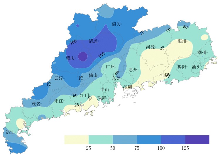 降水:全省平均月雨量52.6毫米,较常年同期偏多3成,且分布不均。月雨量分布(图2):东北、东南局部5.9毫米,西北大部、中部、西南局部75~115毫米(广宁134.6毫米),其余大部分地区25~75毫米。与常年同期相比,东北、东南、西南局部正常~偏少8成,西北、西南、肇庆局部偏多1~2倍(广宁2.3倍),其余大部分地区正常~偏多1倍。