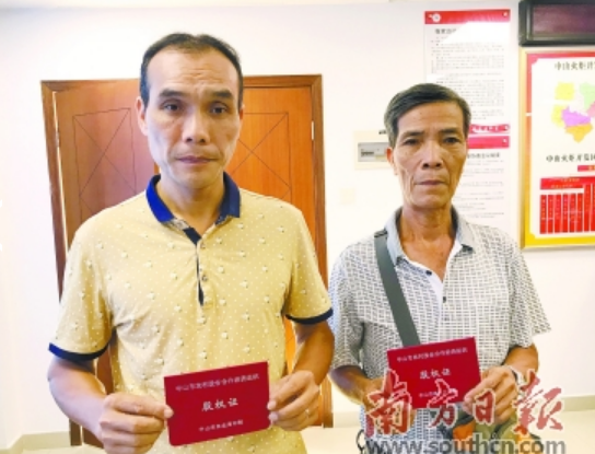 中山市火炬开发区张家边社区村民展示股权证。省农业厅供图