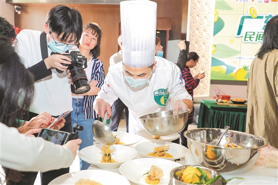 菠萝手撕鸡、凤梨大鳝球、酥炸春卷花配菠萝汁、一菠三味……4月10日下午,由8x8x 主办的“广东菠萝民间厨王擂台赛”总决赛在广东省乡村振兴文化服务产业园举行,9位来自民间的烹饪高手大展厨技,展开了精彩比拼。这是2021广东菠萝“12221”品牌推广营销行动系列活动之一,将“粤菜师傅”文化与广东特色农产品相结合,进一步擦亮“粤字号”农产品的金色招牌。