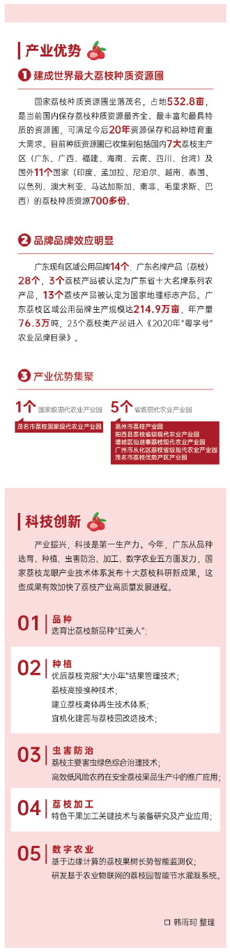 科技是第一生产力,创新是引领发展的第一动力。当前,广东正着力加大科技创新,通过加强荔枝优良品种选育和栽培技术研发、果园机械化数字化升级、保鲜加工关键技术及装备研发、完善冷链物流设施、升级荔枝加工设施等多方面举措,不断扩大鲜荔枝销售半径和周期,焕发产业发展内生动力,推动荔枝产业加快转型升级。