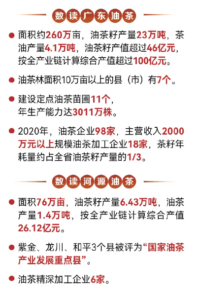 两年来,广东下达中央财政补助资金1.67亿元,组织开展低产低效油茶林改造36.4万亩,目前广东省油茶种植面积约为260万亩,产值46.5亿元。2022年1月,《广东省乡村产业发展规划(2021-2025)》发布,提出优先支持丝苗米、油茶等优势特色产业跨区域集群发展,广东油茶产业进一步迈向高质量发展。