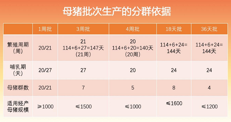 “批次化生产是指母猪按照一定的时间节律进行配种、分娩组织猪场生产的技术。”根据批次配种时间间隔,一般分为“一周批”、“三周批”、“四周批”、“18天批”、“36天批”。张守全介绍了母猪批次生产的分群依据、产房及定位栏设计参数以及不同批次化方式的优缺点。