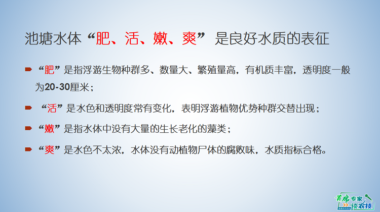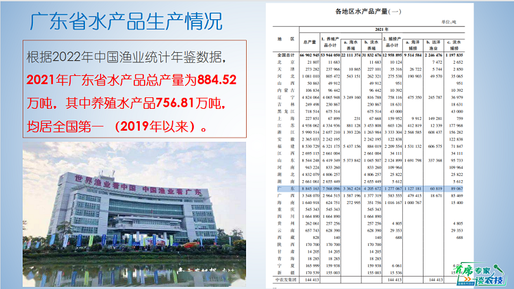 水产养殖环境岗位专家赖子尼研究员在直播中从广东省水环境质量状况谈起,指出水产品质量安全中养殖水环境的重要性,提出了“养鱼先养水”,藻相与水色调控是“养水”的突破点。
