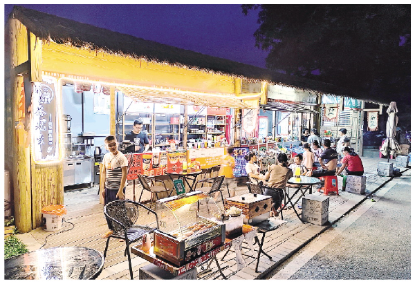 入夜,黎子龙经营的露天茶座,客人越来越多。 袁瀚 摄