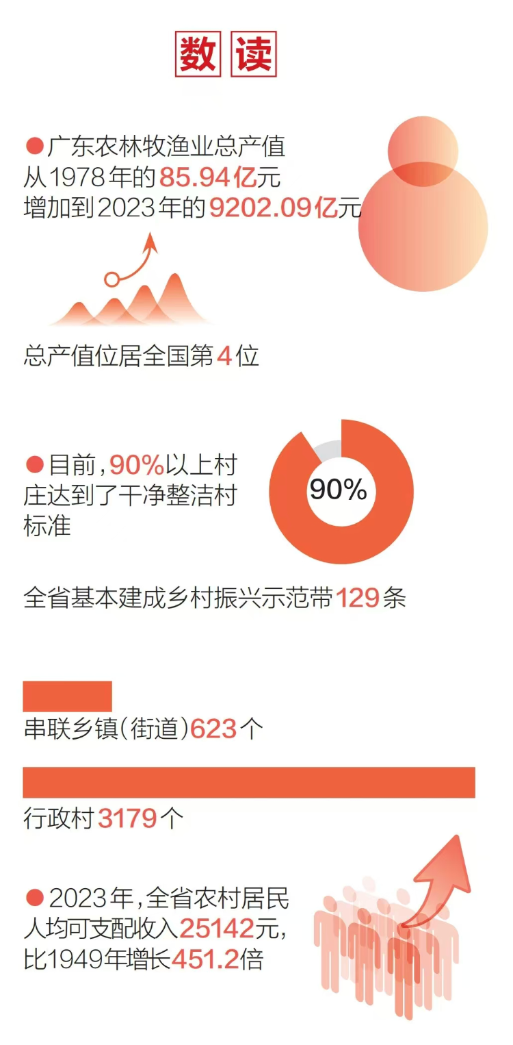 作为中国经济第一大省,广东“三农”工作同样取得了长足进步:强农惠农富农支持制度越来越健全,“四个优先”落得越来越实,城乡融合步伐越来越快……广东正加力提速推进“百千万工程”、有力有效推进乡村全面振兴,着力深化“三农”领域改革,不断激发农业农村发展活力和内生动力,推动农业农村现代化和城乡区域协调发展迈上新台阶,加快实现从农业大省向农业强省蝶变,一幅农业农村高质量发展的壮美岭南画卷正徐徐展开。