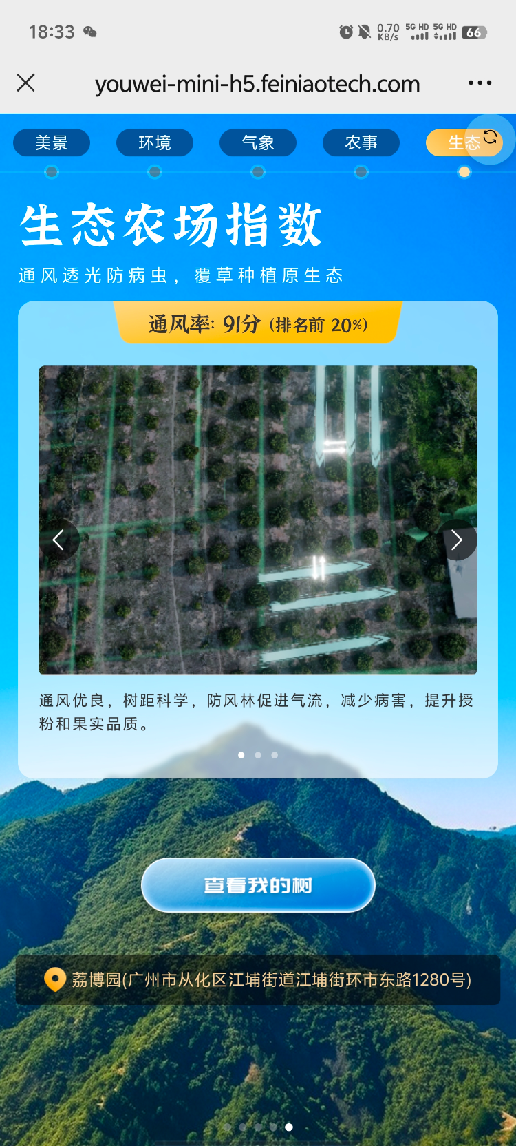 在挂上签有名字的专属“身份证”后,用户即可通过扫码查看果园环境、生长档案等详细信息,还能每日接收果树专属成长影像,直观见证荔枝由青转红的成熟过程,也可选择亲自来果园采摘。不仅如此,平台设有美景、环境、气象、农事、生态等板块,可以实时查看园区的生态山水画卷和荔枝花果盛景,同时透明化生态农事操作的全流程。