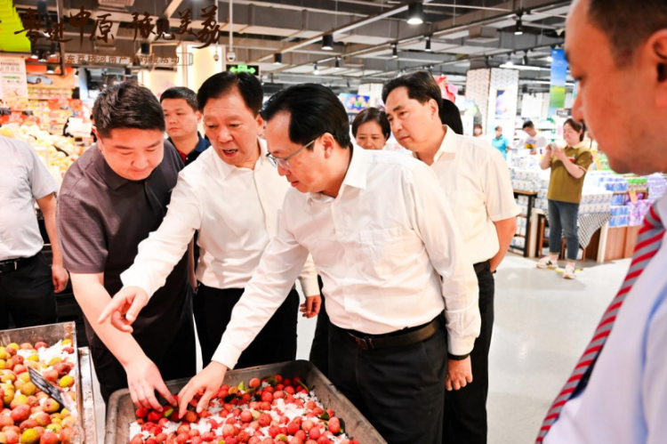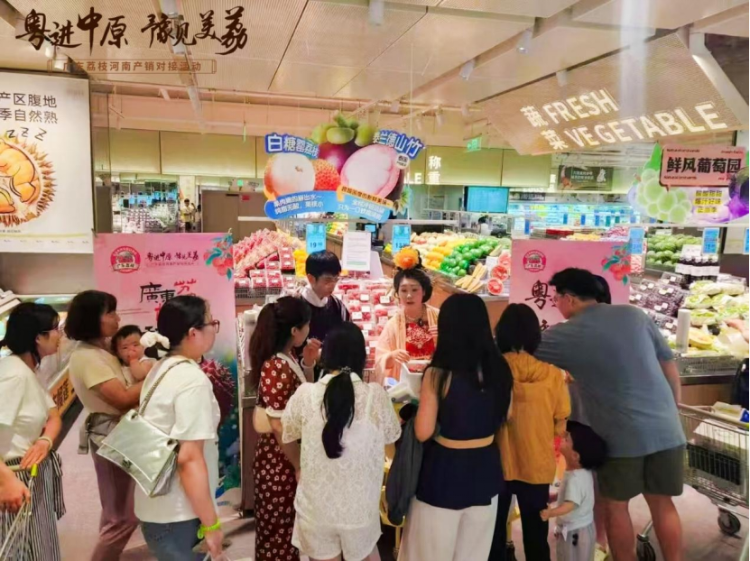 豫粤两地农业农村部门调研广东荔枝在郑州商超的销售情况。