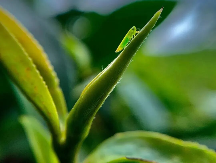 初夏小满、初冬禾黄,正是曾长期被视为茶树“害虫”——小绿叶蝉的活跃期,它会刺吸茶叶汁液,被叮咬的茶叶叶缘会微微卷曲、叶脉泛着独特红晕。