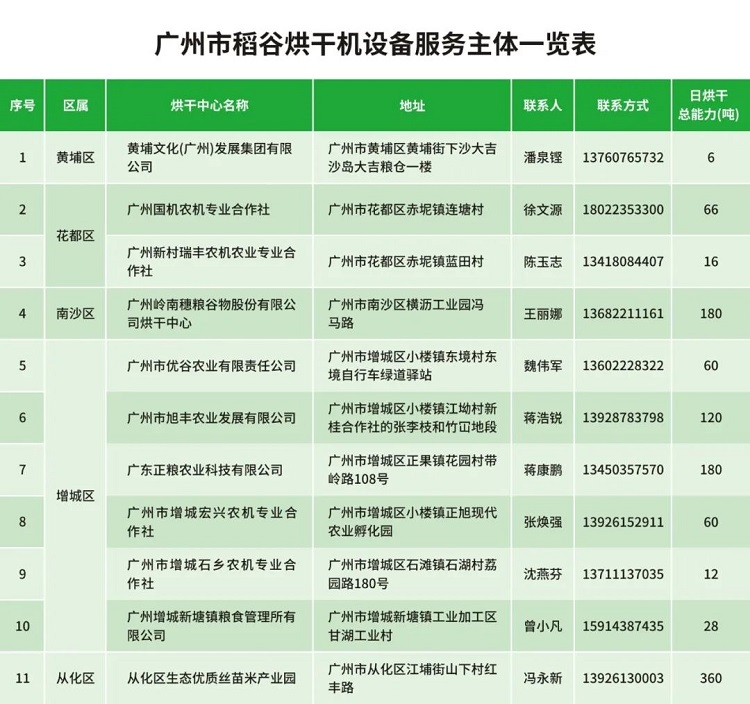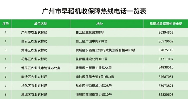 现将《广州市稻谷烘干机设备服务主体一览表》和《广州市水稻机收保障热线电话一览表》公布如下,方便机手和农民反映相关情况,实现农机服务供需对接,及时解决困难问题。