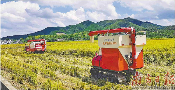 东源县柳城镇下坝村智慧农业示范园内,无人驾驶收割机和无人驾驶运粮车正在作业。
