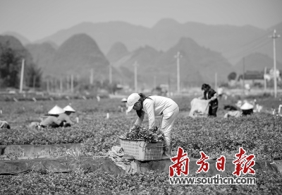 阳山县朋塘村500亩标准化旱地西洋菜种植基地内,村民正在采摘西洋菜。记者肖雄 摄