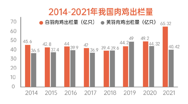 据中国畜牧业协会数据,2021年,我国共出栏65.32亿只白羽肉鸡,占肉鸡总出栏量的56.43%,比往年有所提升。