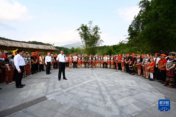 4月10日至13日,中共中央总书记、国家主席、中央军委主席习近平在海南考察。这是11日下午,习近平在五指山市水满乡毛纳村,同黎族村民王柏和一家亲切交谈。新华社记者 谢环驰 摄