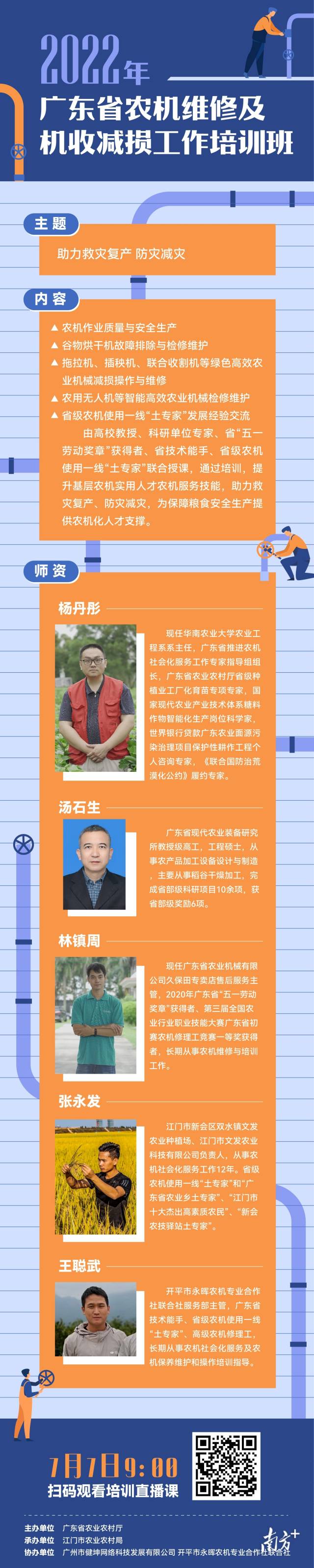 7月7日,2022年广东省农机维修及机收减损工作培训班将在江门市举办,上午9时同步开展网络直播课。