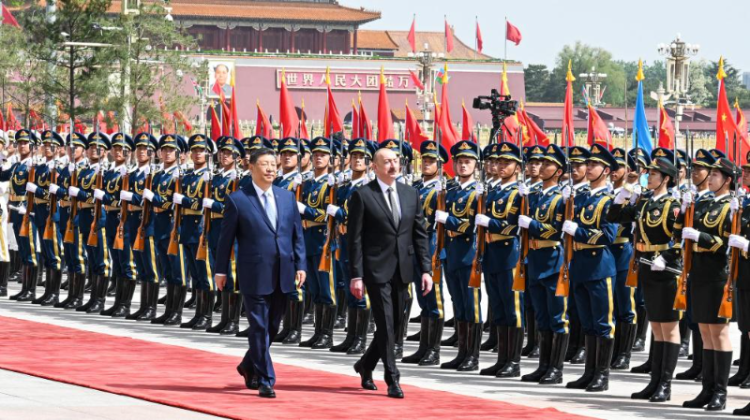阿利耶夫抵达时,礼兵列队致敬。习近平同阿利耶夫登上检阅台,军乐团奏中阿两国国歌,天安门广场鸣放21响礼炮。阿利耶夫在习近平陪同下检阅中国人民解放军仪仗队,并观看分列式。
