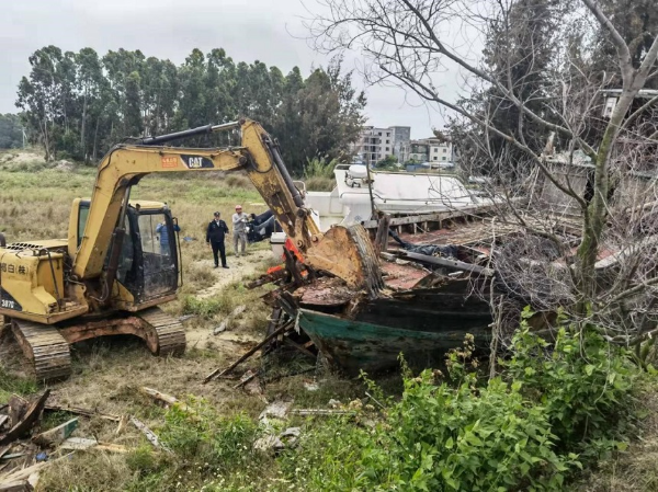 3月29日,茂名电白区海洋综合执法大队在南海街道勤海码头举行电白区没收涉渔“三无”船舶拆解现场会,对2022年第一批违法捕捞涉渔“三无”船舶进行拆解。活动现场,随着挖掘机启动作业,6艘涉渔“三无”船舶被依法解体、碾砸、销毁处置。