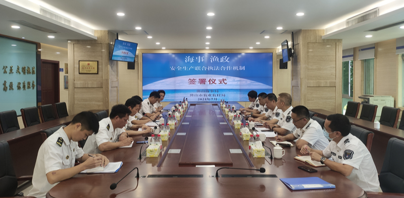 为进一步加强我市水上运输和渔业船舶安全生产工作,防范化解商渔船重大风险,增强部门间的沟通与合作,落实佛山市安全生产委员会关于《佛山市加强水上运输和渔业船舶安全风险防控工作的实施方案》工作要求,7月27日上午,市农业农村局与佛山海事局举行“海事 渔政安全生产联合执法合作机制签约仪式”,市农业农村局刘和平支队长、佛山海事局林国汉副局长及相关科室(单位)负责人参加了签约仪式。