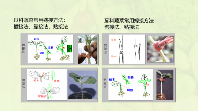 瓜类、茄果类常用嫁接方法。