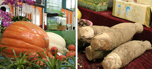 图左为珠海展区近400斤的巨型南瓜,图右为韶关展区重达几十斤的香芋。