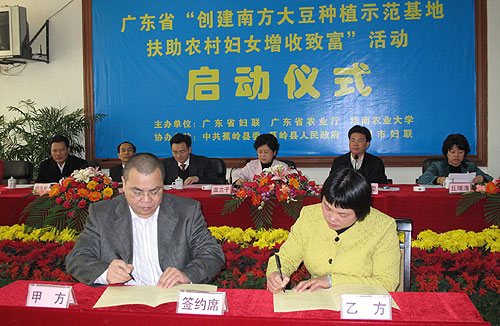3月11日上午,广东省梅州市蕉岭县长潭镇神岗村彩旗飘飘、人头攒动,由省妇联、省农业厅、华南农业大学共同主办的广东省“创建南方大豆种植示范基地,扶助农村妇女增收致富”活动启动仪式隆重举行。省妇联、省农业厅、华南农业大学、省扶贫办相关领导,韶关、河源、梅州等9个地级市妇联和农业局领导以及梅州市100多人出席了会议。