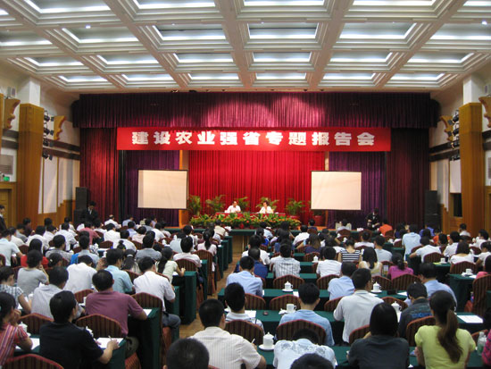 7月9日下午,广东省农业厅在广州举办了“建设农业强省”专题报告会,邀请湖南省政协副主席、中国工程院院士、国家杂交水稻工程技术研究中心主任袁隆平和农业部农村经济体制与经营管理司副司长关锐捷在会上作专题报告。省农业厅、省属农业科研机构和高等院校近250人参加了会议。报告会由省农业厅程萍副厅长主持。