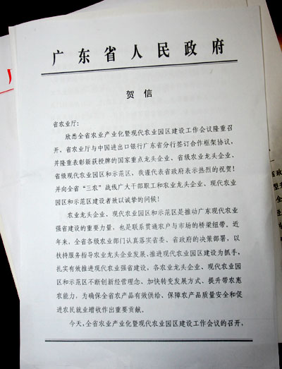 刘昆副省长在贺信中强调,农业龙头企业、现代农业园区和示范区是推动广东现代农业强省建设的重要力量,也是联系贯通农户与市场的桥梁纽带。近年来,全省各级农业部门以扶持服务指导农业龙头企业发展、推进现代农业园区建设为抓手,扎实有效推进现代农业强省建设,各农业龙头企业、现代农业园区和示范区为确保全省农产品有效供给、保障农产品质量安全和促进农民就业增收作出了重要贡献。刘昆副省长表示,省农业厅与中国进出口银行广东省分行签订合作框架协议,对于充分发挥银行金融系统的信贷资金支持作用,促进农业产业化发展具有重要意义。希望全省各级农业部门、银行金融部门及各农业龙头企业、现代农业园区和示范区,进一步解放思想、开拓创新、发挥优势,加快促进农业龙头企业发展和现代农业园区建设,推动全省农业企业“走出去”利用国内国外两种资源、开拓两个市场,进一步做强做大。