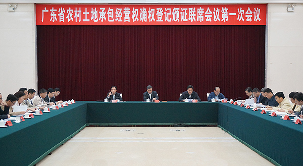 2014年11月10日,省农村土地承包经营权确权登记颁证联席会议第一次会议在广州召开。省委马兴瑞副书记出席会议并讲话,省政府邓海光副省长主持会议,省委魏建飞副秘书长、省政府颜学亮副秘书长,以及省委组织部、省委宣传部、省委农办、省财政厅、省国土资源厅、省农业厅、省林业厅、省海洋渔业局、省法制办、省信访局、省档案局、省妇联等部门有关负责同志参加了会议。会议听取了省农业厅郑伟仪厅长关于全省农村土地承包经营权确权登记颁证试点工作进展情况汇报,分析了当前工作面临的突出问题,研究部署了下一步工作,会议还研究讨论了省联席会议办公室提交的《广东省农村土地承包经营权确权登记颁证联席会议制度》和《关于解决农户承包地细碎问题的指导意见》。