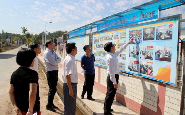 蔡树淦同志一行在驻村工作组及村“两委”干部的陪同下,实地检查了石岗村的扶贫项目:村口广场、发展粮食生产项目示范片、集中拆旧建新综合治理示范点、文化广场、宣传栏、老师宿舍楼以及刚装修完毕的村委会办公楼,并听取驻村工作组对扶贫开发“双到”工作情况汇报。