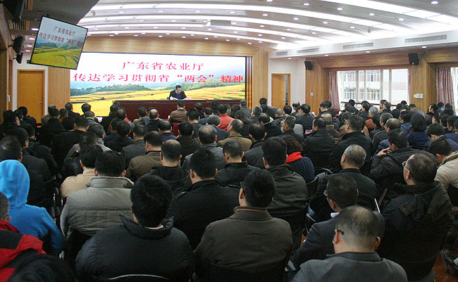 2月1日上午,省农业厅召开全厅干部大会,传达学习贯彻省“两会”精神。厅党组书记、厅长郑伟仪主持召开会议,指出,要深入学习领会省“两会”精神,把贯彻落实“两会”精神与当前农业农村经济各项重点工作紧密结合,推进广东特色农业现代化加快发展。