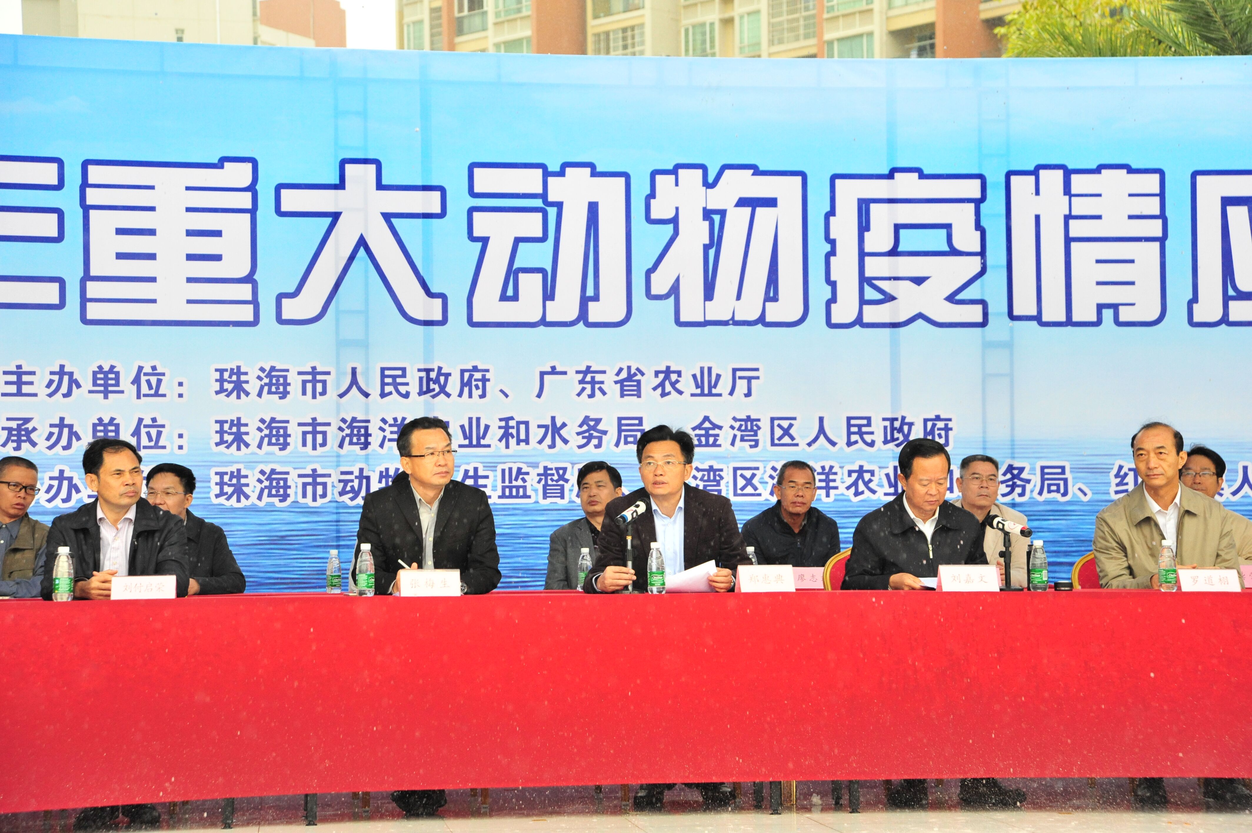 冬季以来,我省进入H7N9流感和H5N1高致病性禽流感等动物疫病高发期,动物疫病防控形势复杂严峻。为进一步规范重大动物疫情应急处置程序,锻炼应急处置队伍,提高应急处置能力,11月10日上午,省农业厅、珠海市人民政府联合在珠海市举行了2016年重大动物疫情应急演练。省农业厅副厅长、省畜牧兽医局局长郑惠典,珠海市人民政府副市长刘嘉文,各地级以上市兽医管理部门负责人、珠海市重大动物疫病防控指挥部成员单位负责人及各区人民政府领导、农牧部门负责人共100多人观摩了演练。
