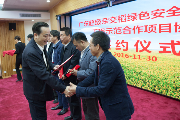 11月30日上午,广东省农业厅与国家杂交水稻工程技术研究中心在广州签约“广东超级杂交稻绿色安全高产高效示范工程合作项目”。广东省农业厅郑伟仪厅长,被誉为“杂交水稻之父”的袁隆平院士,国家杂交水稻工程技术研究中心有关领导及专家,广东省农科院有关领导及专家,华南农业大学有关领导及专家,省农业厅有关处室和事业单位负责同志共60多人参加了签约仪式。郑伟仪厅长向项目组的各位专家颁发了聘书,签约仪式由省农业厅副厅长程萍主持。