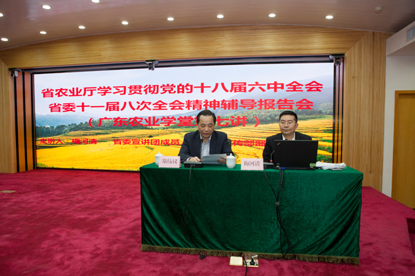 12月9日下午,省农业厅党组书记、厅长郑伟仪同志主持召开党组中心组学习会,广东农业学堂第七讲,专题学习党的十八届六中全会、省委十一届八次全会精神。学习会邀请省委宣讲团成员、省纪委宣传部梅河清部长作学习辅导报告。全厅机关公务员、事业单位班子成员、大院内副科以上干部共160多人参加了学习会。
