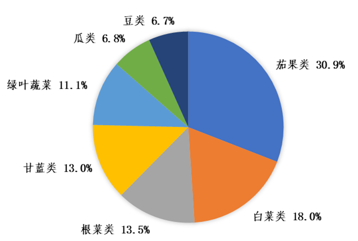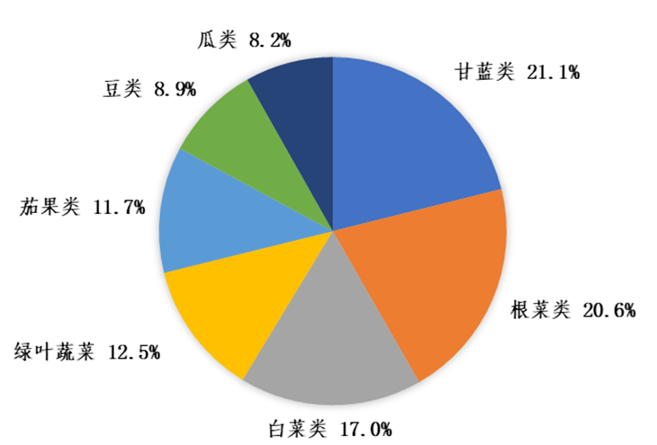 产量排名前五的是甘蓝类、根菜类、白菜类、绿叶蔬菜和茄果类,产量占比分别是21.1%、20.6%、17.0%、12.5%和11.7%。分种类而言,产量排名前五的是西兰花、甘蓝、胡萝卜、大白菜和菜心,占比分别是10.1%、9.0%、8.0%、6.1%和5.9%。