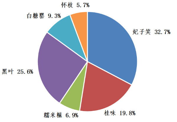 荔枝生产稳定,产量预增。4月正值荔枝果实生长期,雨季来临,有助于果实发育,粤西和珠三角产区丰产有保障,但粤东产区降雨不均,果穗上出现无幼果或落果现象,导致减产,其中惠州、汕尾等产区部分规模化基地预计减产约20%。整体来看,2021年广东荔枝仍将实现丰产,预计产量140万吨,同比增长4.2%,种植的六大品种中,妃子笑、黑叶、桂味占比超75%。
