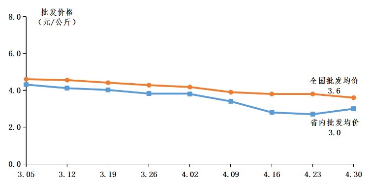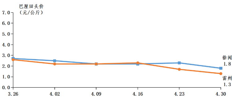 菠萝田头行情下降。据省农业信息监测体系数据,4月菠萝田头均价2.2元/公斤,环比下降31.3%,同比下降4.3%。菠萝批发均价3.0元/公斤,环比下降18.9%,同比增长30.4%。4月上旬菠萝田头最高价行情3.8元/公斤,田头均价2.2元/公斤;随着菠萝上市量增加,中旬菠萝田头最高价行情略有下降,菠萝田头最高价行情降至3.2元/公斤,田头均价2.2元/公斤;下旬菠萝田头最高价行情维持在3.2元/公斤,田头均价2.3元/公斤。