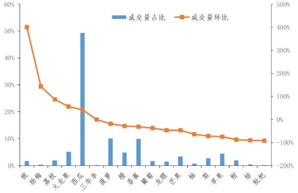 批发市场水果总成交量环比增加38.9%,省内主要批发市场成交量占比前三的水果是西瓜、菠萝和香蕉,占比分别为49.3%、10.0%和9.7%。5月成交量环比增幅前三的水果分别是桃、杨梅和荔枝,成交量环比分别增长400.0%、143.3%和87.8%;枇杷、桔和柑的成交量降幅较大,环比分别下降92.4%、90.1%和86.9%。