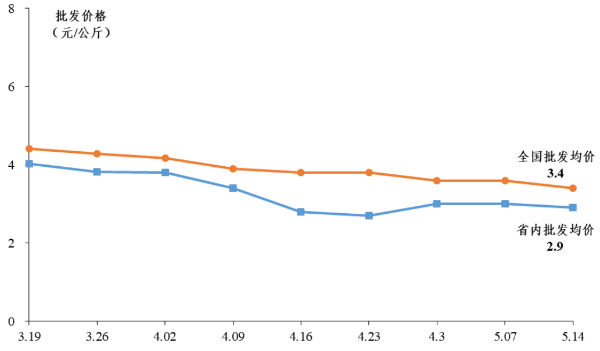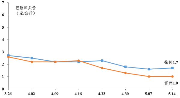 菠萝田头行情下降。据省农业信息监测体系数据,5月菠萝田头均价1.4元/公斤,环比下降36.4%,同比下降12.5%。菠萝批发均价3.0元/公斤,与上月持平,同比下降14.3%。