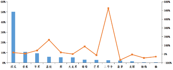 批发市场水果成交量增加。批发市场水果成交量增加,环比增加8.3%,省内主要批发市场成交量占比前三的水果是西瓜、香蕉和苹果,占比分别为50.2%、10.8%和9.3%。三华李、荔枝、葡萄的成交量增幅较大,环比分别增加526.5%、163.1%和87.9%,菠萝、杨梅和柚的成交量降幅较大,环比分别下降68.1%、44.6%和29.6%。