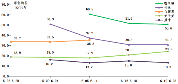 荔枝零售行情稳定。据省农业信息监测体系数据显示,各零售平台荔枝销售品种有所不同,平台定价波动较小,上半年荔枝零售行情基本保持稳定。主要零售平台妃子笑、白糖罂、桂味、黑叶和糯米糍零售均价分别为19.8元/公斤、34.1元/公斤、36.9元/公斤、14.3元/公斤和52.5元/公斤。