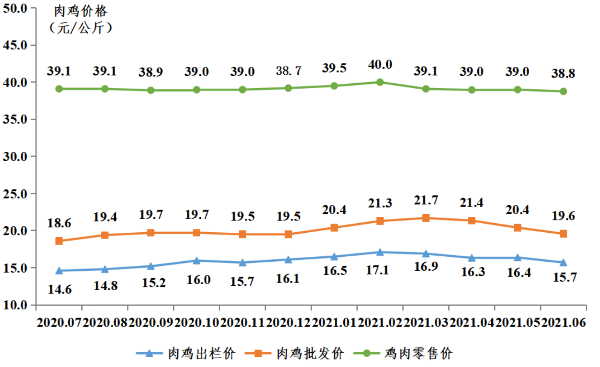 肉鸡消费逐步恢复,行情稳定。随着今年新冠肺炎疫情得到控制,肉鸡消费恢复,行情也逐渐回升。据省农业信息监测体系数据,今年上半年较去年同期肉鸡价格上涨,出栏价和批发价分别为16.5元/公斤和20.8元/公斤,同比分别增长2.5%、7.3%,据地市“菜篮子”价格数据,肉鸡零售价为39.2元/公斤,同比下降2.5%。