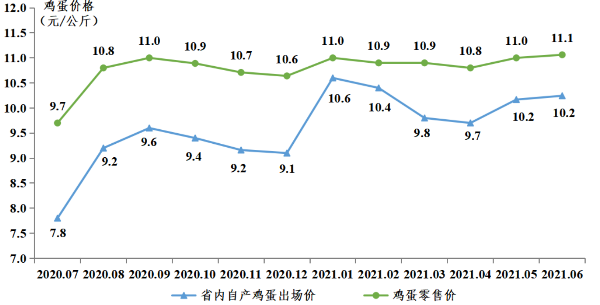 鸡蛋需求量增加,行情上涨。上半年已完成复工复产,鸡蛋消费需求同比上升,我省鸡蛋市场行情“升温”。据省农业信息监测体系数据,上半年我省鸡蛋出场价为10.2元/公斤,同比增长14.0%,据地市“菜篮子”价格数据,零售价为10.9元/公斤,同比增长0.7%。第二季度正值中秋月饼备货时期,鸡蛋出场价为10.0元/公斤,环比持平,据地市“菜篮子”价格数据,零售价为11.0元/公斤,环比增长0.2%。