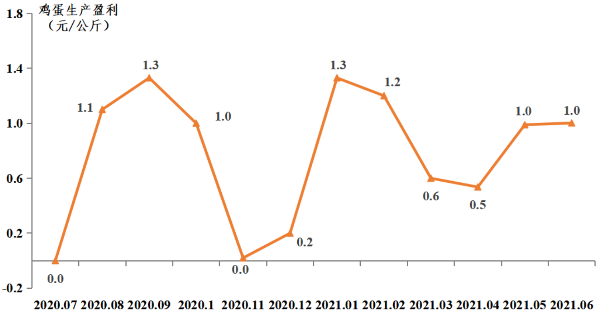 蛋禽饲料成本增加,养殖盈利少。饲料原料价格居高不下,导致盈利空间小。据省农业信息监测体系数据,上半年鸡蛋生产成本为9.2元/公斤,同比增长17.2%,利润率为9.5%,同比增长5.0%。饲料成本6.0元/公斤,同比增长6.4%,鸡苗成本3.7元/只,同比增长3.8%,兽药及防疫费成本0.2元/公斤,同比增长25.5%。第二季度鸡蛋生产成本为9.2元/公斤,环比增长1.3%,整体养殖利润率为8.3%,环比下降1.7%。