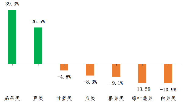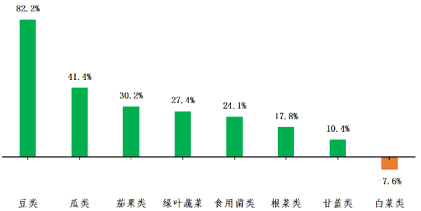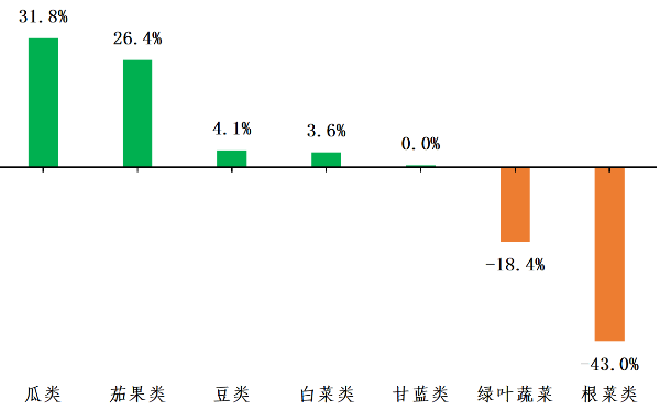 分种类而言,瓜类和茄果类蔬菜产量增加明显,同比分别增长31.8%和26.4%,其中苦瓜、茄瓜和番茄产量增加幅度较大;豆类和白菜类产量同比增长4.1%和3.6%。产量明显下降的是根菜类和绿叶蔬菜类,同比分别下降43.0%和18.4%。甘蓝类蔬菜产量维持稳定。